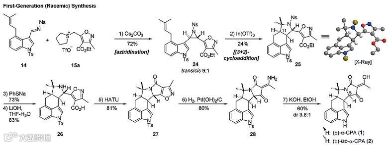 作者首先使用非手性的硫鎓盐15a考察合成路线的可行性。15a与吲哚亚胺14在碳酸铯存在的条件下反应,以72%的产率、9:1的反式/顺式构型比例得到吖丙啶中间体24,24在Lewis酸In(OTf)3的作用下进行[3+2]环加成反应,以24%的产率得到环加成产物25,其构型通过X射线单晶衍射分析得以确定。25接着进行Ns保护基消除和酯水解两步反应得到氨基酸中间体26,26在标准的酰胺偶联条件下形成内酰胺27,27接着发生氢化裂解和水解两步反应,由此完成消旋α-CPA的合成工作。