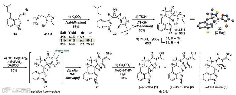 作者首先对硫鎓盐31a、31b和31c与吲哚亚胺14的反应情况进行考察,权衡产率、对映选择性和非对映选择性,31b脱颖而出,以61%的产率,9:1的非对映选择性和98:2的对映选择性得到吖丙啶中间体32,32在TfOH的辅助下进行[3+2]环加成,并消除Ns保护基得到环化中间体34,33的构型通过X射线单晶衍射分析予以确定。34接着进行分子内钯催化的插羰反应得到内酰胺中间体27,27受环张力的影响发生原位的N-O键断裂,得到亚胺中间体28,该物种接着发生水解反应,反相制备HPLC分离提纯,最终分别得到手性的(-)-α-CPA (1)与(+)-iso-α-CPA (2)产物。
