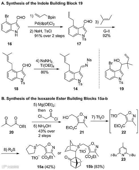 作者首先合成亚胺结构单元14。从商品化的溴代吲哚甲醛16出发,16与烯丙基硼酸酯在Pd催化剂的作用下发生Suzuki偶联,随后进行氮原子的Ts保护基修饰,以两步91%的总收率得到偶联产物17,17接着与2-甲基-2-丁烯发生烯烃复分解反应得到中间体18,18与NsNH2发生脱水缩合,以80%的产率转化为最终的吲哚亚胺中间体14。作者曾尝试通过一步反应,以16的异戊烯基化得到18,然而考察了许多反应条件均没有取得成功,仅得到醇产物19。硫鎓盐15a-b可通过已知的醇21与Tf2O混合,进一步与硫醚作用两步反应得到,其中15a是非手性的,而15b是手性的。