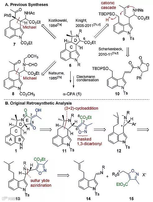 α-CPA可以从L-色氨酸出发通过生物合成的途径进行合成。到目前为止,共有四项工作报道了α-CPA的全合成研究,这些合成方法具有相同的构建特拉姆酸单元的策略,通过Dieckmann缩合反应形成C6-C7键。Alan Kozikowski和Mitsutaka Natsume课题组分别报道了分步构建C环和D环的合成方法,但反应的非对映选择性比较差。David Knight教授发展了阳离子型串联反应的策略,非环前体9可以高立体选择性地转化为吲哚9。相比之下,Jürgen Scherkenbeck教授使用相同的底物在不同的条件下仅得到了1:1比例非对映选择性的混合物。最近,英国布里斯托大学的Varinder Aggarwal教授受到生物合成方法的启发,以九步线性步骤,发展了一种汇聚式对映选择性合成α-CPA及其相关天然产物的方法。合成中包括亚胺与手性硫叶立德的对映选择性吖丙啶化、吖丙啶与烯烃的[3+2]环加成、串联的插羰内酰胺化/溴异噁唑N-O键断裂构建乙酰基特拉姆酸结构等关键反应。相关工作发表在Angew. Chem. Int. Ed. 上。