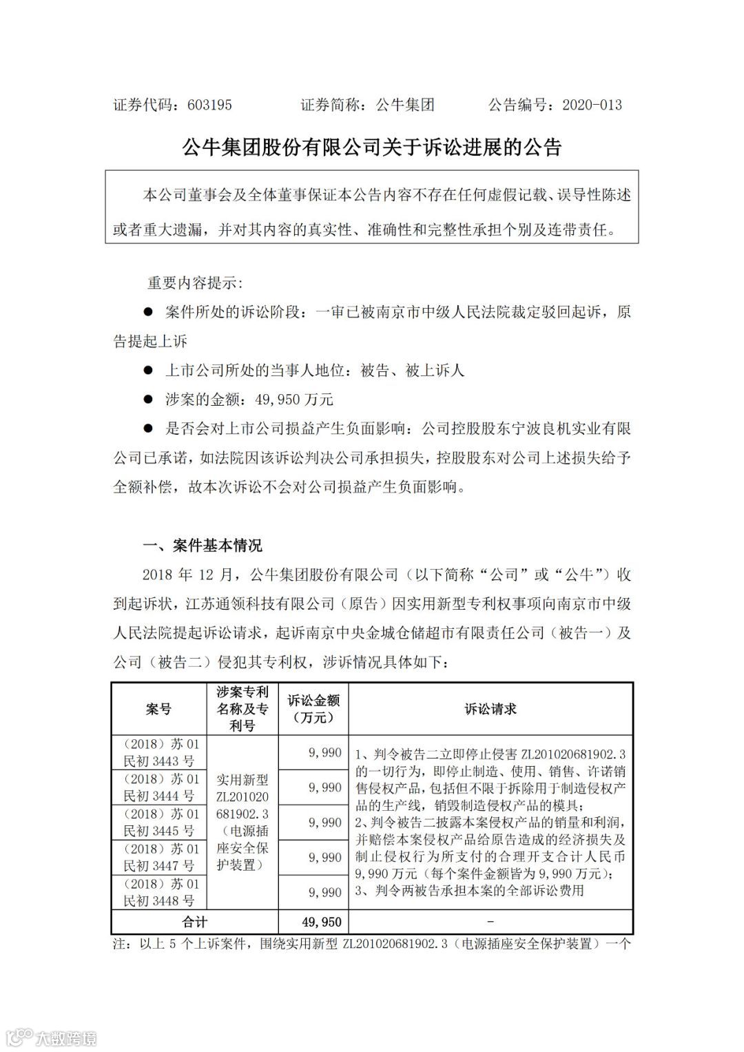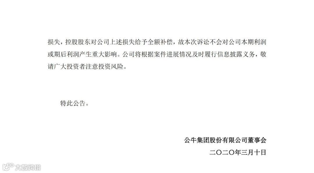 对于上述纠纷,3月10日的公告中,公牛集团控股股东宁波良机实业有限公司承诺,如法院因该诉讼判决公牛集团承担损失,控股股东将对上述损失给予全额补偿。