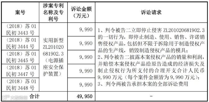 注:以上5个上诉案件,围绕实用新型ZL201020681902.3(电源插座安全保护装置)一个专利,涉及五起诉讼,除涉及产品不同,其他起诉内容皆相同。专利主要涉及到公司转换器和墙壁开关插座产品等。