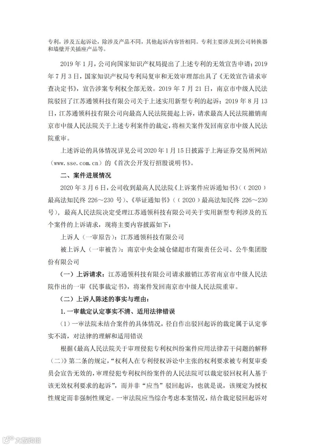 2020年3月6日,公司收到最高人民法院《上诉案件应诉通知书》(﹝2020﹞最高法知民终226~230号)、《举证通知书》(﹝2020﹞最高法知民终226~230号), 最高人民法院决定受理江苏通领科技有限公司关于实用新型专利涉及的五个案件的上诉请求。