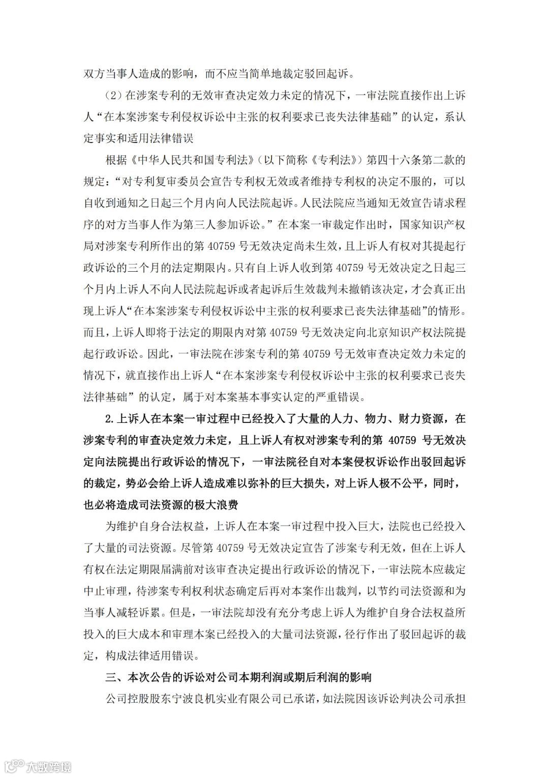 在公告中,通领科技认为,南京市中院“在本案一审裁定作出时,国家知识产权局对涉案专利所作出的第40759号无效决定尚未生效,且上诉人有权对其提起行政诉讼的三个月的法定期限内”,在这个关键时刻,南京市中院直接作出上诉人“在本案涉案专利侵权诉讼中主张的权利要求已丧失法律基础”的认定,一审裁定“认定事实和适用法律错误。”