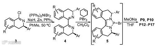 催化剂的制备过程如图3所示,手性亚氨基氯3在Ni催化剂的作用下进行还原偶联反应得到手性双亚胺中间体4。4接着在PBr3/环己烯存在的条件下得到中间体5,然后与甲醇钠作用得到最终的催化剂P9、P10和P12-P17。