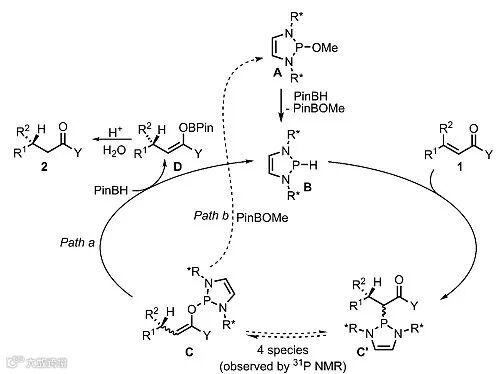 作者根据NMR实验的数据,提出了如下反应机理。首先预催化剂A和PinBH通过σ键复分解得到活化的DAP催化剂B,B接着与α,β-不饱和烯烃进行加成反应得到中间体混合物C和C',C与C'之间存在的动态平衡通过31P NMR得以确认。C接着通过a途径得到烯醇硼化物D和催化剂B,D水解得到最终产物,由此完成催化循环。作者又基于化学计量的A设计了NMR跟踪实验,提出反应还可能通过b途径进行。在该路径中,C与形成的PinBOMe发生σ键复分解反应得到最终的硼氢化产物D和A,也可完成催化循环。由于体系中PinBH的浓度要大于PinBOMe,a途径更加合理,但无法排除b反应途径。