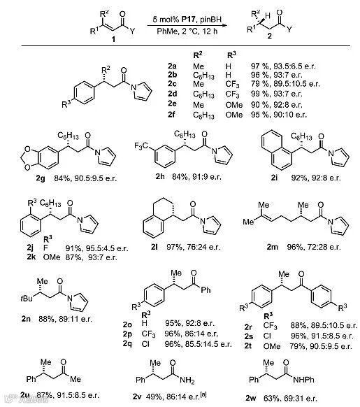 在最佳条件下,作者对底物的适用性进行了考察。他们首先固定Y为吡咯基团,考察R1和R2取代基对反应的影响。当R1为芳基取代基,R2取代基和芳香环上的R3取代基对反应的影响较小,不同底物都能以良好的结果得到产物2a-2k。当R1和R2为环状取代基时,产物2l的对映选择性只有76/24。当R1为脂肪族取代基时,取代基位阻越大,产物的对映选择性越高。作者接着考察Y为芳基取代基或烷基取代基时的反应情况,不同底物也能以良好的结果得到产物2o-2u。而当Y为氨基取代基时,产物的对映选择性出现了不同程度的下降。