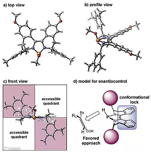 为了对反应产生对映选择性的原因具有更加深入的了解,作者对催化剂P17进行单晶培养,并提出如图6d的不对称还原催化反应模式。