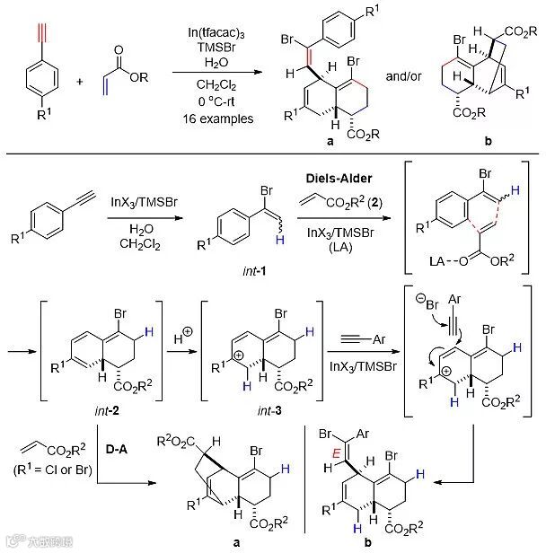 当使用的反应底物芳基乙炔的苯环4位有取代基时,在水存在的条件下,研究人员发现此时的主要产物是两种十氢化萘衍生物:前者带有苯乙烯取代基(a),而后者具有桥环结构(b)(图4)。通过理论计算和一系列的机理实验研究表明,这两种产物中的十氢化萘环系均由原位生成的溴代苯乙烯(int-1)和丙烯酸酯之间的Diels-Alder 反应获得。在此反应过程中,苯环的芳香性被完全破坏从而得到十氢化萘中间体(int-2)。当具有很高反应活性的int-2和另一分子的芳基乙炔发生串联反应会生成产物a;而如果该中间体和另一分子的丙烯酸酯反应则得到产物b。值得注意的是,由于破坏苯环的芳香性需要较高的能量,通常此类的去芳构化Diels-Alder反应需要较高的反应温度或者使用十分活泼的烯烃。而本反应在室温下即可顺利进行,而且反应原料也是活性相对较低的丙烯酸酯。此外,本反应具有很好的立体选择性,尽管产物中有多个新生成的手性中心,但是最终得到的都是单一的非对映异构体产物。