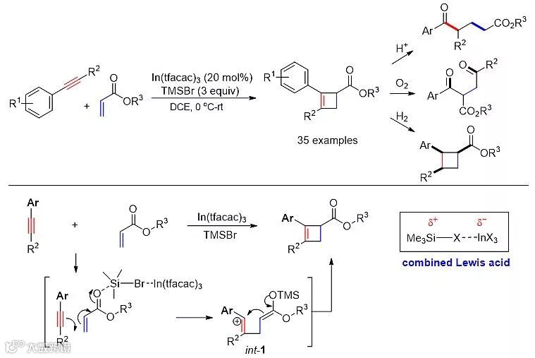 罗德平教授和沈志良教授团队长期致力于研究和发展铟化学相关的有机合成方法学,并将其运用于天然产物和具有生物活性化合物的合成。研究发现由三价铟和三甲基溴硅烷组成的“组合路易斯酸”可以有效地促进芳基炔烃和丙烯酸酯衍生物之间的[2+2]-环加成反应得到相应的环丁烯产物。有趣的是,单独使用三价铟或三甲基溴硅烷作为反应催化剂时,完全没有目标产物生成。通过一系列的反应条件优化发现,使用In(tfacac)3和三甲基溴硅烷作为催化剂可以获得最好的反应产率。运用此组合催化剂可以方便的制备得到一系列带有不同取代基的环丁烯衍生物。该环丁烯产物是很有用的有机合成中间体,例如在酸或者氧气的条件下,其可以发生选择性开环反应生成具有合成价值的1,4或1,5-二羰基化合物。 此外在氢气和钯/碳的作用下,环丁烯产物可以高对映选择性的还原为环丁烷。通过香港城市大学的Hajime Hirao教授和Kazuki Doitomi博士对上述[2+2]-环加成反应的实验和理论计算研究发现:铟催化剂和三甲基溴硅烷可以形成一种新的路易斯酸——组合路易斯酸,其酸性明显比单一的铟催化剂或三甲基溴硅烷强。该组合路易斯酸可以更好的活化丙烯酸酯,从而促进[2+2]-环加成反应的进行。