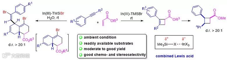 近日,南京工业大学先进化学制造研究院(IAS)的罗德平教授和沈志良教授团队报道了由常见的化学原料芳基炔烃和丙烯酸酯反应选择性合成环丁烯衍生物和高度官能化的十氢化萘衍生物的方法(图2)。在由三价铟和三甲基溴硅烷(TMSBr)原位生成的“组合路易斯”催化下,芳炔可以和丙烯酸酯通过分子间的[2+2]-环加成反应生成环丁烯衍生物,同时该产物可以很方便的转化为天然产物中常见的带有苯基和酯基取代基的环丁烷衍生物。此外,在水存在的条件下,相同的组合路易斯催化剂可以催化苯乙炔和丙烯酸酯发生串联的去芳构化反应生成多取代的十氢化萘衍生物。