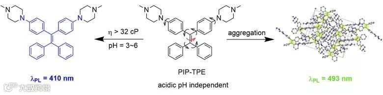 华南理工大学发光材料与器件国家重点实验室唐本忠院士秦安军教授研究团队,设计了一种不依赖于酸性pH的哌嗪-四苯基乙烯(TPE)聚集诱导发光分子探针(AIEgen)用于溶酶体示踪。该探针通过不同的聚集态可以表现出不同的荧光发射:非聚集态时为蓝色,聚集态时为黄绿色(图1)。荧光产生的机制在于AIE分子在溶酶体内的分子运动受到体系粘度的限制,蓝色发射的产生是由于在激发态下探针分子质子化物种的C=C键高度扭曲。这项工作可用于开发新的对pH稳定的具有聚集诱导发光(AIE)特性的溶酶体荧光探针。这一成果近期发表在Chemical Science (IF=8.668)上,华南理工大学助理研究员蔡元婧和香港科技大学博士研究生归晨为该论文的共同第一作者。