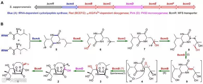 图2. 双环霉素的生物合成基因簇(A)和完整的生物合成途径(B)