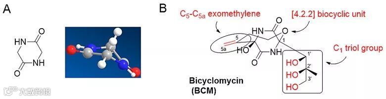 图1. 2,5-二酮哌嗪骨架(A)和双环霉素(B)的化学结构