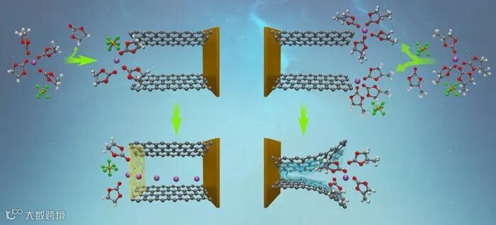 如此重要的SEI膜是如何形成的?为什么有些电解液分解产物可以形成稳定的SEI膜,而有些电解液却会在高于嵌锂的电位下持续发生还原分解,最终导致石墨层结构坍塌?这种界面行为的差异最典型的应该是锂离子电池发展史上众所周知的“碳酸丙烯酯(PC)和碳酸乙烯酯(EC)的差异”。PC在嵌锂电位以先(~0.7 V)发生持续的还原分解,最终使得石墨结构坍塌,无法正常嵌脱锂。而EC,其分子结构仅比PC少一个甲基,却在略高于0.7 V电位下发生分解形成一层稳定的SEI膜,从而抑制电解液在更低电位的分解,使得锂离子可在石墨材料中正常地嵌入和脱出。在过去的二十余年时间里,有部分的科学家尝试去揭示PC和EC行为差异的原因,但至今没有一种机理模型可以让人完全信服。例如Zhuang等人提出,PC和EC的差异是由于PC在电极表面经历双电子还原,直接生成Li2CO3和丙烯气体,后者导致石墨层结构破坏。而EC则经历单电子还原,形成碳酸酯聚合物。然而,这种机理却无法解释Xu等人在PC和EC还原反应中均检测到单电子还原产物碳酸酯低聚物的实验结果。Tasaki 则认为这种差异主要是由于PC在石墨层形成的共嵌物[Li(PC)n]+结构体积大于石墨层的层间距,从而撑开破坏石墨层。而EC体系形成的共嵌物体积小于石墨层层间距,所以不会导致石墨层的破坏。然而,这种机理无法解释分子体积比PC大的溶剂分子界面行为却与EC相似的实验现象。