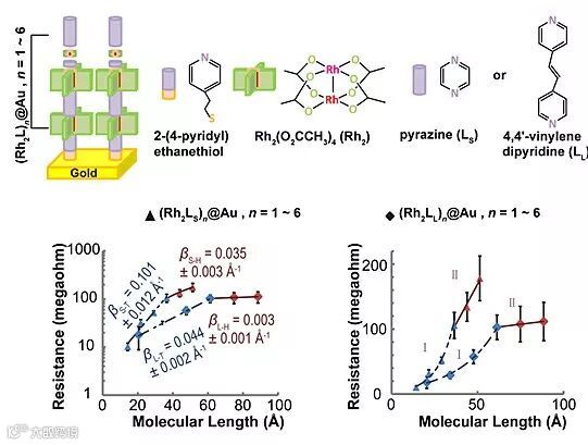 暨南大学刘春元教授课题组以自组装膜为模板,利用分步组装方法,在金电极表面制备了一系列长度和结构可控、含键合双铑单元(Rh2(O2CCH3)4)并具有很小的距离衰减因子的分子导线(β =0.003 Å-1)。该项研究验证了随着分子导线的延长,电荷传输机制从隧穿(Tunneling)转换为跳跃(Hopping),同时发现,对不同结构的分子导线,机理转换均发生链节数相等(n = 4)但长度不同的节点上,由此认为Rh2中心起到了电荷(电子或空穴)跃迁的垫脚石(Step stone)作用。更重要的是,比较分子骨架相似、耦合作用不同的两个体系,发现金属中心之间耦合作用较强的分子导线具有较大的电阻以及较大的电阻随分子长度变化的衰减常数(β)(图1),故其导电性能反而低于弱耦合的导线。DFT计算表明,由键合Rh2单元与有机π桥配体构造的金属-有机杂化分子导线通过π(Rh2)–π(L)轨道作用,形成了与有机炔苯低聚分子相似的π共轭体系,长桥配体(LL)虽然减弱了分子导线金属中心之间的耦合作用,同时也降低了HOMO-LUMO能级差,因此更利于电荷在金属中心间的跃迁,从而实现长程电荷传导。