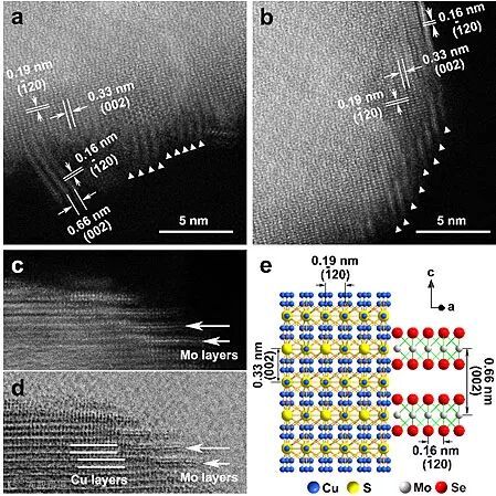 为了清楚地了解这种异质结的界面结构,研究人员利用球差校正电镜进行了一系列的表征。结果表明所制备的Cu2-xS-MoSe2异质结由三种物相组成,Cu2-xS是由Cu1.94S和Cu2S组成的核-壳结构,而MoSe2 则垂直生长在Cu2S壳的表面。结构分析显示MoSe2 与Cu2S之间是晶格匹配的外延生长,MoSe2(002)面的面间距(0.66 nm)恰好是Cu2S(002)面间距(0.33 nm)的两倍;匹配的晶体结构是构建这种特殊异质结的关键。进一步分析显示,MoSe2 晶体中的Mo原子层位于Cu2S晶体的两层Cu原子层中间,这意味着MoSe2 中Se原子层与Cu2S晶体中的Cu原子层直接接触。由于MoS2催化的活性位点在其边缘,MoS2垂直生长在基底表面能暴露更多的催化活性位点。这就是为什么在该研究中通过阳离子交换得到的CdS-MoS2异质结具有高催化活性的重要原因。