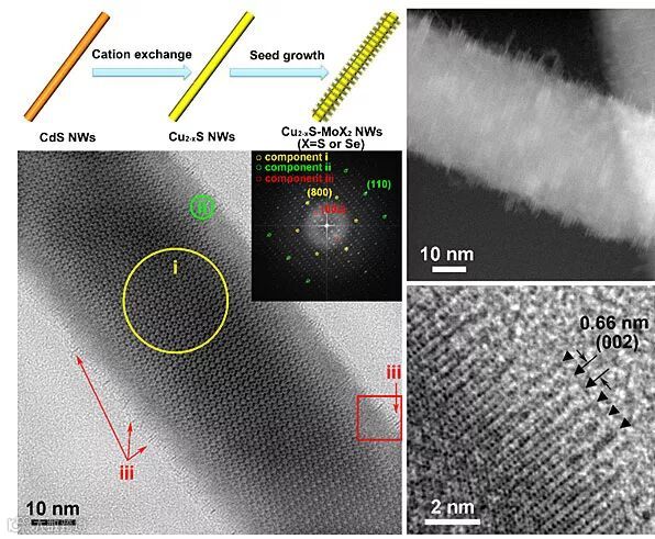 最近,新加坡南洋理工大学张华教授课题组和中科院物理所谷林教授课题组,以及沙特国王科技大学韩宇教授课题组合作,利用Cu2-xS纳米线为模板, 以乙酰丙酮钼为钼源,在高温下(200摄氏度)用蠕动泵缓慢注入硫源或硒源,实现了MoS2或MoSe2以边缘接触的方式垂直外延生长在一维Cu2-xS纳米线上。MoS2和MoSe2的生长密度以及纳米片的大小可以通过控制注入的硫源或硒源的量来调整。重要的是,所制备的Cu2-xS-MoS2可以用阳离子交换的方式转化成CdS-MoS2,且得到的CdS-MoS2可以保持原有的形貌不变。在光解水制氢中 CdS-MoS2显示出优异的催化性能。负载7.7 wt% MoS2的异质结其制氢速率达4,647 μmol•h−1•g−1,是纯CdS的58倍。此工作的相关结果发表在国际著名期刊Journal of American Chemical Society 上。
