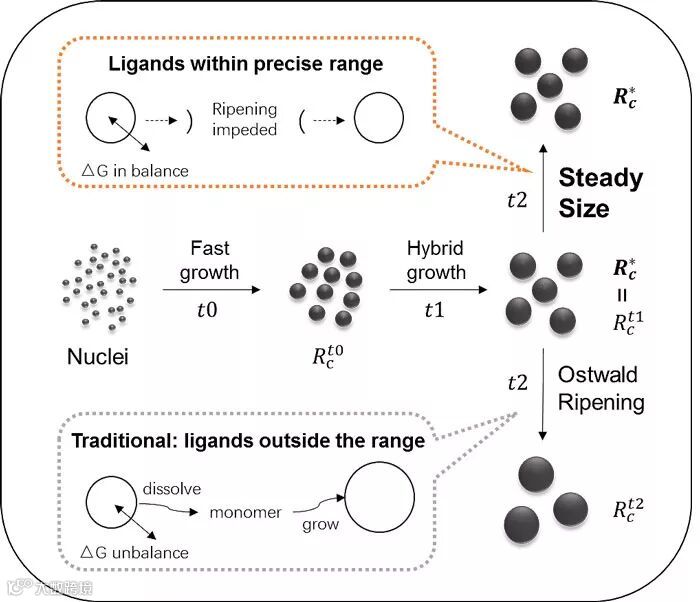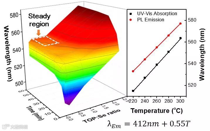 在传统的合成方法中,恒温下量子点尺寸随时间呈现复杂的非线性关系,因此尺寸具有不可预测性。河北工业大学团队开发的恒稳态生长控制方法解决了这一问题,他们通过研究量子点合成中的反应机理,提出利用反应过程中的强弱配体实时转换机制来控制量子点的生长,并通过形成尺寸恒稳态来实现发光波长的精准控制。论文中以合成CdSe和CdS量子点为例,指出严格调控前体溶液中硬脂酸镉(CdSt2)和三辛基膦(TOP)配体的比例可以使量子点在短时间生长后进入尺寸恒稳态。这种尺寸恒稳态仅和反应温度相关,所获得的发光波长和反应温度呈近似线性关系,因此可以通过改变反应温度实现亚纳米量级的波长控制。