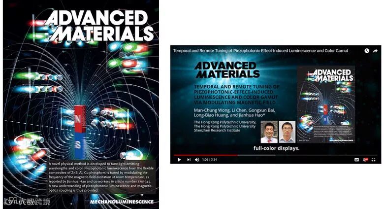最近香港理工大学的郝建华教授团队在基于磁场耦合压电光子学多彩发光研究方面取得重要进展,并成功通过原位和动态方法在不需要改变固定组分的压电发光体上实现可调控多色发光。相关研究结果在Advanced Materials 发表,获选为卷首页和视频摘要。