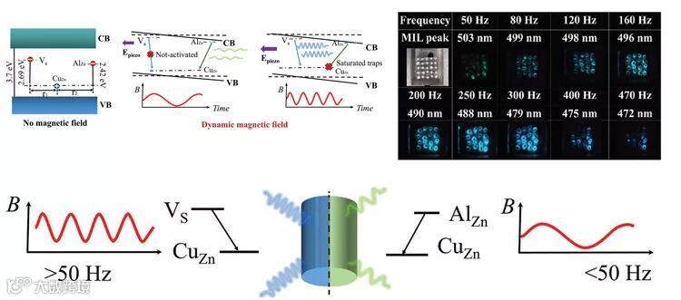 香港理工大学郝建华教授团队早期首次在稀土掺杂铁电薄膜中观察到电场调控光致发光现象(Angew. Chem. Int. Ed., 2011, 50, 6876)以及压电晶体耦合的ZnS:Mn薄膜发光(Adv. Mater., 2012, 24, 1729)。以此为基础,郝建华教授团队近年在多篇综述文章(Adv. Opt. Mater., 2015, 3, 431;Chem. Soc. Rev., 2015, 44, 1585;Adv. Funct. Mater., 2016, 26, 6330)中,提出了突破传统化学方法的物理手段(电场、力、磁场等)原位动态可逆的发光调制想法和策略。在这篇最新发表论文中(Adv. Mater., 2017, 29, 1701945),他们采用动态磁场激发调控压电发光复合材料的能带结构和电荷载流子的陷阱深度,成功地实现非接触调控发射ZnS:Al,Cu荧光体的峰值波长和颜色。在低调制频率交变磁场作用下,诱导较深的电荷陷阱,导致ZnS荧光体在503 nm处绿光发射。随着磁场调制频率的增加,较浅的电荷陷阱可被触发和电离,导致472 nm处蓝光的发射强度增加。此外,通过与YAG:Ce和(Ca1-xSrx)S:Eu长余辉荧光粉的光子能量耦合,实现了RGB三基色和色温可变的白光发光和调控。该研究不仅对发光机制提供了新的认识和理解,而且对磁光学传感、压电光子学、能量收集器件、无损环境监测、新型光源和显示技术等领域的应用和发展具有重要的借鉴参考价值。