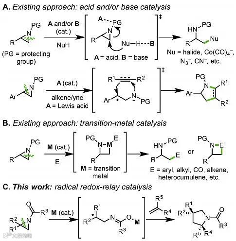 含氮有机化合物广泛存在于药物分子中,高效、高选择性及可持续性构建这些分子显得尤为重要。由于氮杂环丙烷类化合物拥有两个反应位点,开环产物更加多样化。从简单烯烃出发构建氮杂环丙烷结构将促使这类中间体更为丰富易得。目前已报道氮杂环丙烷类化合物的开环方式主要是酸、碱(图1A)或过渡金属催化(图1B)的闭壳反应机理。其主要的反应种类也局限于亲核反应,不饱和分子插入、异构化和偶联反应等。另外,反应的区域选择性也局限于取代较少的C-N键,因而传统的开环反应具有一定的局限性。