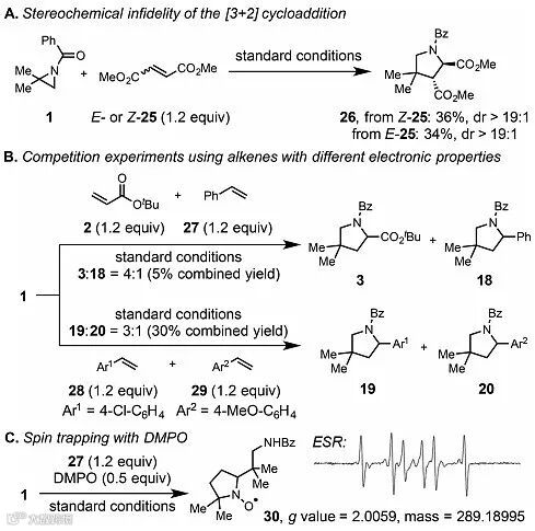 最后,作者对反应的机理进行了验证。反应中无论加入顺丁烯二酸二甲酯还是反丁烯二酸二甲酯,得到的吡咯环中两个酯基都处于反式的相对位置,从而与提出的自由基机理相吻合。另外,作者通过烯烃的竞争反应发现缺电子烯烃的反应速率更快,也与提出的自由基机理一致,并且排除了氮杂环丙烷开环形成碳正离子的可能性。作者还在反应体系中加入DMPO(5,5-二甲基-1-吡咯啉-N-氧化物),利用ESR表征捕获到自由基中间体,并进一步通过质谱分析证明了该中间体的存在。