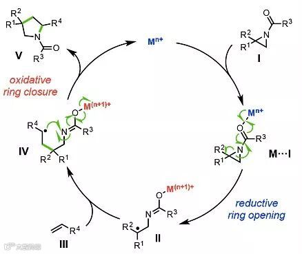 自由基类型的反应具有较高的反应活性,并且选择在取代较多的C-N键开环,形成较为稳定的碳自由基,因而利用自由基类型的开环反应可以有效避免传统反应反应性与区域选择性的局限。普林斯顿大学的Abigail Doyle教授课题组报道了镍催化氮杂环丙烷的自由基开环偶联过程,揭示了自由基类型氮杂环丙烷开环反应的可行性。然而底物大多局限于端位或者苯乙烯衍生的氮杂环丙烷。近期,康奈尔大学的林松教授课题组报道了过渡金属钛催化氮杂环丙烷与烯烃的自由基[3+2]环加成反应构建吡咯环结构,相关工作发表在Journal of the American Chemical Society 上。