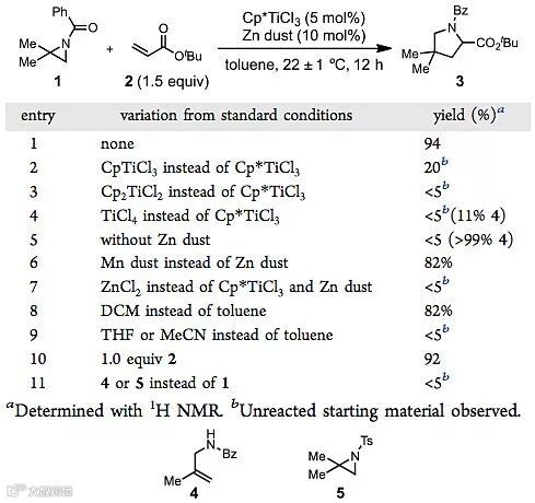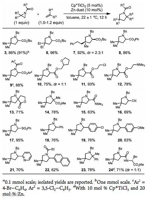 他们首先选择含有酰胺结构的氮杂环丙烷1、丙烯酸叔丁酯2作为反应底物,主要筛选了环戊二烯基配位的钛催化剂、还原剂、溶剂以及不同用量的烯烃,最终发现使用五甲基环戊二烯基三氯化钛作为催化剂、催化量的锌粉作为还原剂、甲苯作为溶剂的条件下室温反应12小时后,可得到94%的核磁共振波谱收率。在最优条件下,作者对底物进行了拓展,发现该反应对于不同种类的烯烃都具有较好的适用性。