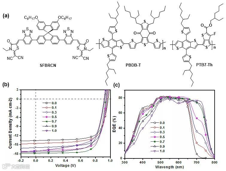 图1.(a)给、受体材料的分子结构;(b)器件的电流-电压曲线;(c)器件的外量子效率曲线。