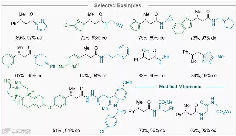 为了同时获得高不对称β-质子化和具有一定稳定性的活性酰基中间体,反应体系对“瞬间稳态”试剂的酸性和亲核性具有严格的要求。通过系统的反应变量研究,他们发现,以氨基茚醇衍生的三氮唑作为卡宾前体,桥头铵盐作为质子梭,咪唑(或者咔唑)作为“瞬间稳态”试剂,反应能够获得具有高度光学活性的β-手性酰基“稳态”中间体,并可被脂肪胺、芳香胺、肼、酰肼、醇、过氧醇、酚、水及硫醇等一系列亲核试剂原位捕获,生成多种β-手性羧酸衍生物。这些产物可以用于迅速构建手性杂环片段,并对多肽进行N端修饰。