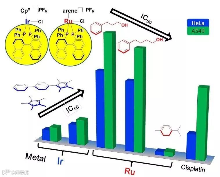 顺铂自50年前发现以来一直应用于癌症治疗,是临床应用最早和最成功的金属药物之一。在金属抗癌药物领域,顺铂是评估抗恶性细胞增殖和对比作用机理的基准。然而由于顺铂以及其他铂类抗癌药物存在一些副作用,如药剂量依赖、某些癌症的抗药性等,研究广谱、低毒副作用和不同于顺铂作用机理的抗癌药物得到人们迫切的需求。近日,曲阜师范大学的刘哲团队设计和合成了联萘二苯膦(BINAP)为配体的金属Ir3+和Ru2+配合物,发现这些金属配合物不仅对不同的癌症细胞具有不同程度的抑制增长的作用,同时更展示了不同于临床铂类金属药物的抗癌作用机理。