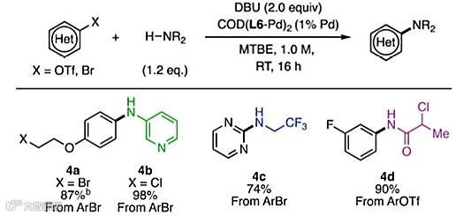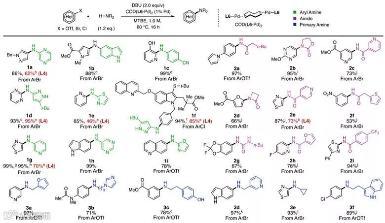 选出最佳的配体后,作者以DBU (2.0 mmol)作为碱、COD(L6-Pd)2 (0.005 mmol, 1% Pd)作为催化剂、甲基叔丁基醚MTBE (1.0 mL, 1 M)作为溶剂,反应在60 ℃条件下进行,对底物的适用范围进行了考察,在杂芳基氯化物、溴化物或者三氟甲磺酸酯和芳香胺、酰胺及一级胺的偶联过程中,20几种底物都表现出中等至优秀的产率,底物中的酯基、羟基、硝基、缩酮、氧杂环、硫杂环等都可以兼容。底物中同时存在Cl和OTf时,OTf的反应选择性明显高于Cl,以89%的收率得到目标产物3f。除了L6配体,有些底物中使用L4作为配体也得到了令人满意的结果。