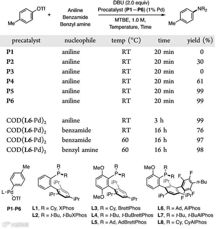 作者以芳基三氟甲磺酸酯和有机胺或者酰胺的偶联反应为例,对不同钯催化剂进行了考察,设计了化学计量的氧化加成反应。在芳香胺、酰胺和伯胺参与的偶联反应中,DBU作为碱的效果好于其他弱碱,如三乙胺(TEA)和DABCO等。他们使用不同对甲苯基-氧化加成的配合物作为催化剂,底物对甲苯基三氟甲磺酸酯与苯胺发生偶联时,多种配体都能够促进C-N偶联反应的发生。当前体催化剂为P6与P5时,反应在室温下几乎定量地生成了交叉偶联产物,使用P4仅以中等的产率得到目标产物,膦配体包含环己基(Cy)时不能得到任何目标产物。最终,作者选择了商品化、空气中稳定的L6配位的预催化剂COD(L6-Pd)2来进一步研究不同pKa和亲核性的胺参与的C-N键偶联反应。当苯甲酰胺与芳基三氟甲磺酸酯偶联时,反应得到76%的收率,升温至60 ℃后,收率提高至97%。作者使用苄胺作为底物也观察到了类似的反应活性,表明该配体可以促进不同胺类底物参与偶联过程。