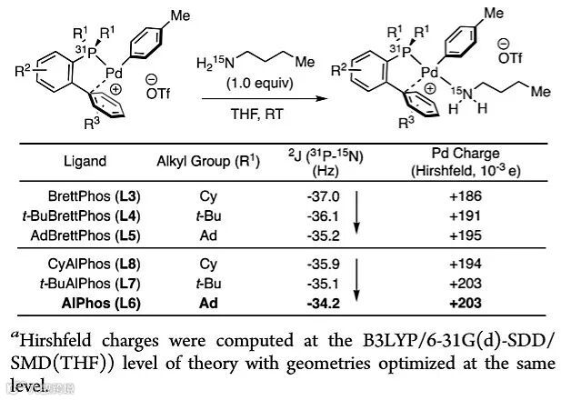 作者还使用15N修饰正丁胺的配合物来研究配体的空间大小对Pd中心原子电荷密度的影响。AlPhos和BrettPhos配体中31P-15N两键偶合的NMR波谱分析表明,含有较大烷基的配体表现出较小的偶合常数(Ad <t-Bu <Cy),反式31P-15N 2J 耦合常数直接受到Pd中心给电子能力的影响,当Pd带有更多的正电荷时,胺结合的配合物表现出更小的负2J 值,因此可以推测,Ad配体给电子能力最弱,与DFT计算结果一致。使用AlPhos(L6)作为配体可以得到最小的2J,表明此时与该络合物结合的胺最容易发生去质子化,由此解释了L6在弱碱条件下参与反应的优势。