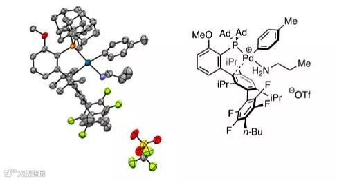 在化学计量和催化量的实验中,作者分别观察到含有大位阻烷基的配体比小位阻烷基的配体表现出更好的反应效果。受Tyler课题组工作的启发,假设磷修饰烷基的大小可能通过配体的空间构型影响钯的亲电活性,由此影响钯结合胺N-H键的酸性。这种酸化作用的大小直接影响关键去质子化步骤的容易程度,并因此决定所需碱的强度。胺结合的氧化加成配合物的结构可以通过X射线单晶衍射分析来阐明,胺与膦分别在钯金属中心的反位。