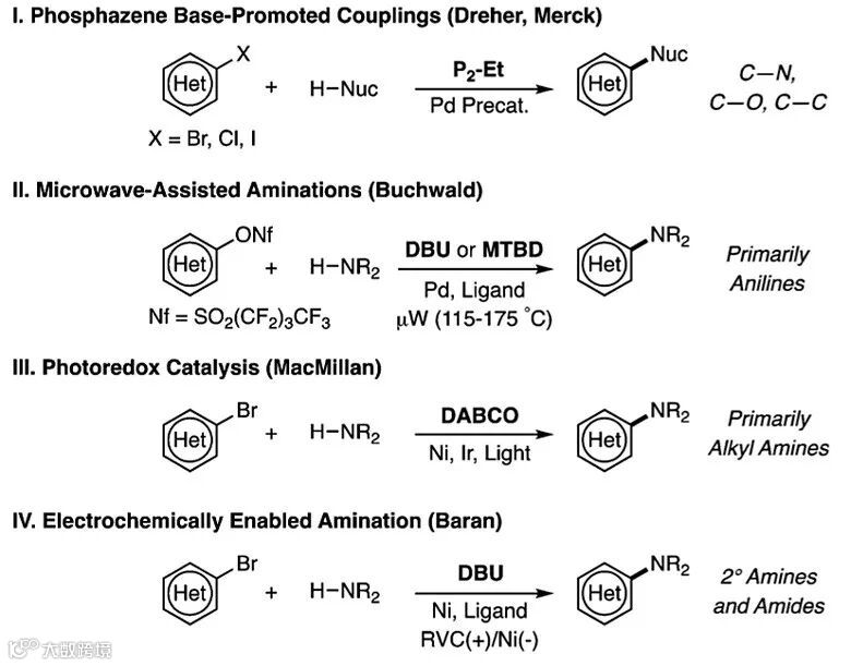 尽管有机碱可广泛用于有机合成,具有广谱的pKBH+,适用于连续流动化学,与亲电官能团能够很好地兼容,但在C-N键偶联的应用中并不多见,目前仅有的几例报道分别是膦化合物作为碱促进的偶联反应、Stephen Buchwald课题组发展的DBU或者MTBD促进的偶联反应,但底物仅限于一级芳香胺,且需要微波高温条件。David MacMillan课题组也发展了DABCO促进光氧化还原催化的偶联反应,但底物适用范围也较为有限。Phil Baran课题组组发展了DBU作为碱、电化学促进的偶联反应,适用的底物包括二级胺和酰胺。为了克服以上方法的局限性,作者发展了一种新的催化体系,利用商品化的配体和有机弱碱实现了多种胺类化合物的偶联过程。