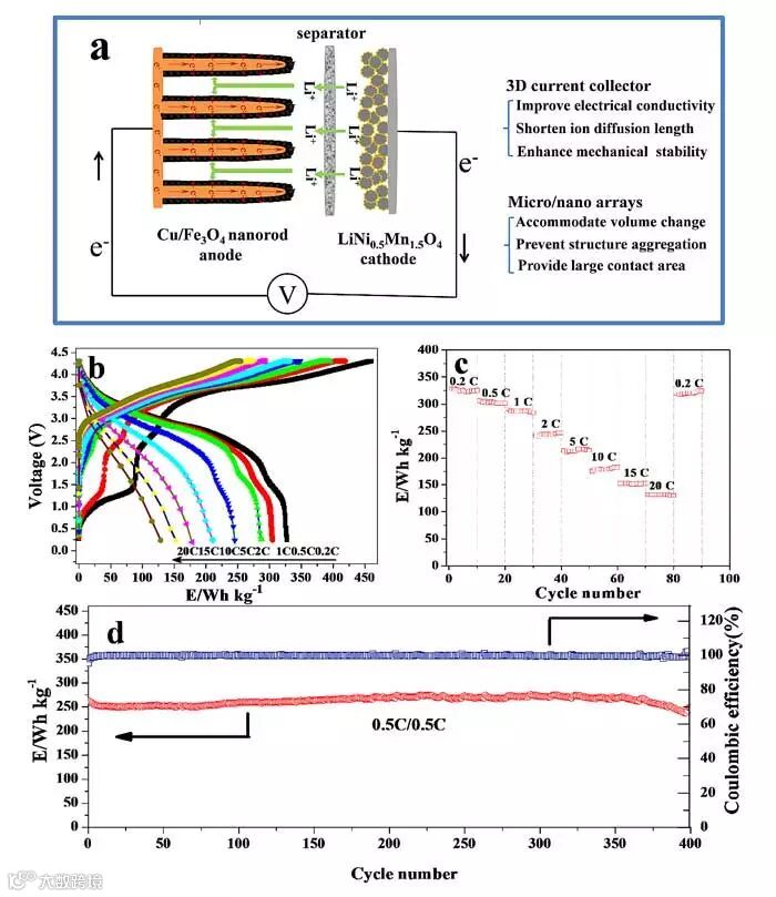 图2.(a)以3D结构Cu/Fe3O4核壳纳米棒阵列为负极,LiNi0.5Mn1.5O4为正极构建全电池的示意图;(b)全电池的充放电曲线(能量密度与电压);(c)全电池倍率循环性能图;(d)全电池循环性能(1C=140 mA g-1)。