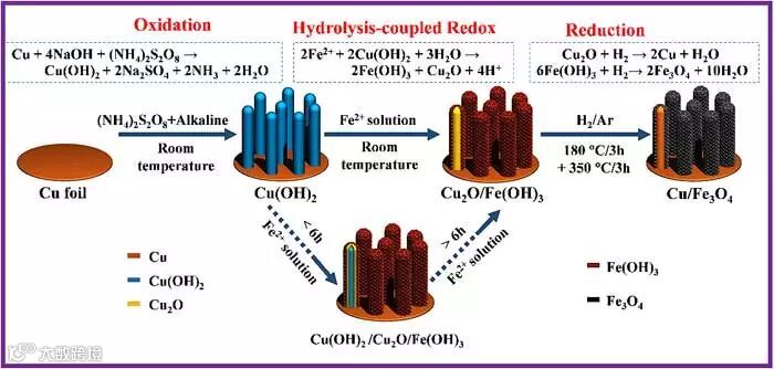 图1. 水解诱导氧化还原反应制备3D结构Cu/Fe3O4核壳结构阵列示意图。