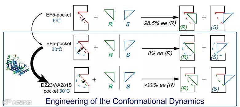 具有高对映体选择性的酶被广泛用来生产医药中间体,然而有些酶只在低温下表现出优秀的对映体选择性,随着温度的升高,对映体选择性逐渐降低。这严重降低了生产速率,增大了生产成本,阻碍了工业化应用。那么,如何使这些酶在室温等温和条件下仍然保持高对映体选择性呢?近日,江南大学刘立明教授团队以南极假丝酵母脂肪酶B(CALB)突变体EF5催化3-TBDMSO戊二酸酐生产(R)-3-TBDMSO戊二酸单甲酯(洛伐他汀药物中间体)为模式反应,利用构象动力学工程手段进行了深入研究。