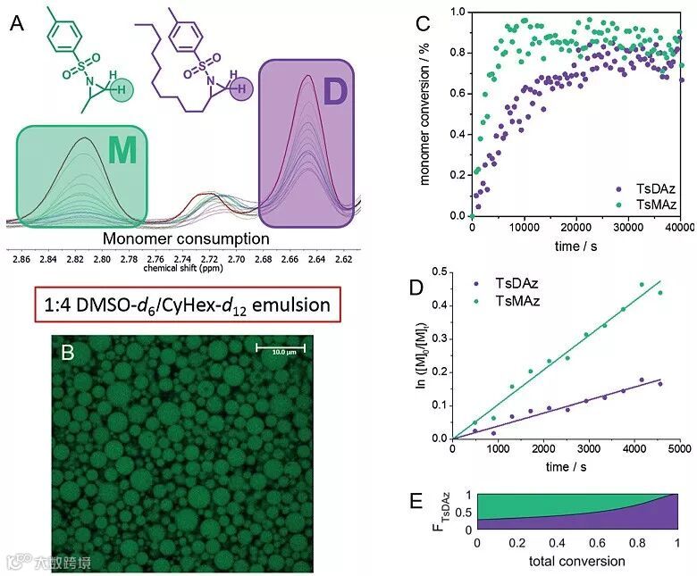 聚合体系中磺酰基氮杂环丙烷单体的聚合活性与磺酰基取代基的性质密切相关,磺酰基结构上存在更多的吸电子取代基能够提高其聚合速率;而氮杂环丙烷环上的N-烷基取代基对其开环聚合活性影响不大。基于此可以分别精细调控单体的溶解性和聚合活性。在该研究聚合体系中单体M溶于分散相DMSO,单体D则溶于连续相环己烷。1H NMR在线监测分析表明两单体竞聚率相当(r1* r2= 1.05),为较理想的共聚体系。同时,研究表明体系聚合反应锁定在DMSO相中,聚合速率只与分散相中单体浓度相关。另外,产物溶于DMSO,不溶于环己烷。基于两组分不同的溶解性,在有/无表面活性剂的情况下都能实现两组分的有效隔离化,这为该体系在不同应用中的搭建提供了便利。