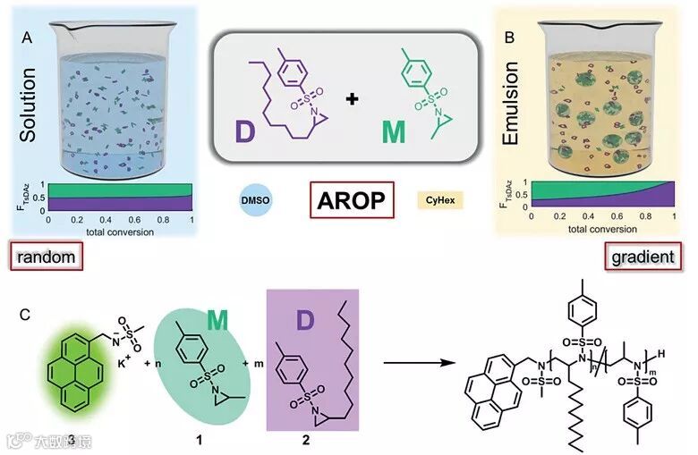 近日,德国马克斯普朗克聚合物研究所的Katharina Landfester教授和Frederik R. Wurm博士等研究者采用活性阴离子开环聚合(AROP),基于单体的溶解性不同,将两种单体组分(单体M:2-methyl-N-tosyl-aziridine,TsMAz;单体D:2-decyl-N-tosylaziridine,TsDAz)分别存储于乳液的分散相(DMSO)和连续相(环己烷)中,通过调节单体比例和连续相单体浓度(扩散速率)等参数调控,简便地实现了具有梯度结构聚合物体系的制备(下图B/C)。相比之下,溶液中只能发生随机阴离子共聚(下图A)。相关成果发表于Angew. Chem. Int. Ed. 杂志。