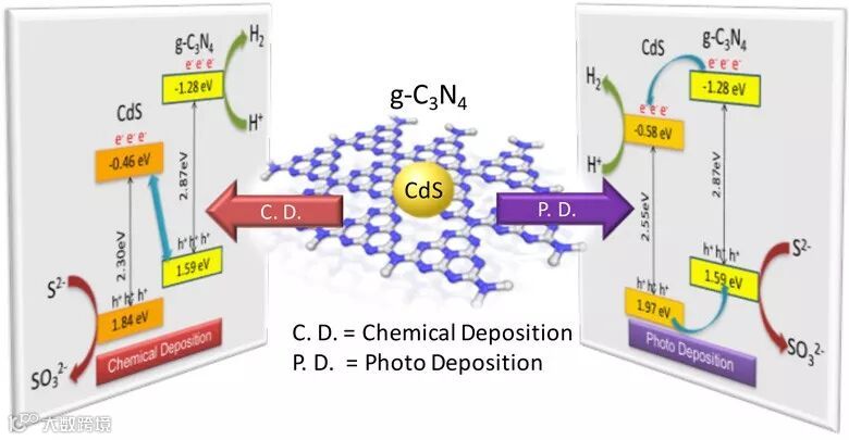 最近,北京工业大学的孙再成教授课题组发现,可以利用光沉积技术来实现对光生电荷的有效控制,从而实现有意识地构建异质结结构或者直接型Z-scheme。作者想到光沉积技术广泛应用于光催化剂中助催化剂Pt的负载,利用光生电子来还原Pt,并将Pt纳米颗粒沉积在光生电子流动的位点。因此,作者以石墨相氮化碳为底物,利用光沉积技术来还原单质硫沉积的CdS纳米颗粒,由此获得CdS/g-C3N4复合光催化剂。由于CdS沉积在g-C3N4光生电子流向的位点,会使g-C3N4的电子更易流向CdS,从而获得II型异质结型的复合光催化剂。为了对比研究,他们同时利用化学法制备了没有沉积取向的CdS/g-C3N4,发现在化学沉积的复合光催化剂中,Z-scheme类型的占据主导。PL光谱以及电荷传输示踪法证明了上述两种方法分别制备得到传统Ⅱ型异质结以及直接Z型纳米复合结构,并通过光催化活性以及稳定性表征进一步证明了上述结果。该成果为利用光沉积技术合理构建传统Ⅱ型异质结和直接Z型纳米结构提供了潜在的可能性。如果更换底物和沉积的半导体将可以实现对异质结或直接Z-scheme类型光催化剂的构建。该研究成果近期发表在ACS Catalysis 上,文章的第一作者为博士研究生姜文帅,通讯作者为孙再成教授。