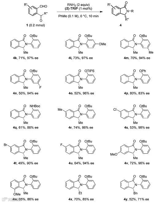 在优化条件下,作者对底物的普适性进行了考察,主要考察了R、R'和R''取代基对反应结果的影响,取代基的位阻和电性对反应影响很小,不同芳基酮与胺类底物参与反应都能以中等到良好的产率(50-80%)和良好到优秀的对映选择性(71-97%)得到产物4k-4y。