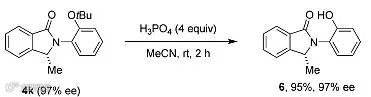 作者还以4k为例进行了产物衍生化,在磷酸的作用下,反应以乙腈作为溶剂,室温条件下进行2小时,能以95%的产率和97%的对映选择性得到叔丁基消除的产物6,与此同时对映选择性不会受到影响。