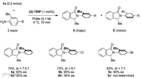 作者还发现,当使用2-叔丁基苯胺作为底物时,反应会形成阻旋异构的缩合产物,产物的非对映选择性最高可达到7.5/1,对映选择性基本都在90%以上。