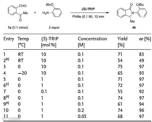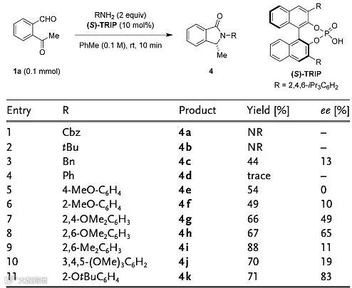 邻甲酰基芳基酮与胺首先形成环状双半胺醛,随后脱水形成羟基异吲哚啉,再经过异构化形成异吲哚啉酮,其中异构化过程是控制产物对映选择性的关键。Hans-Günther Schmalz教授等人曾通过在极性反应体系中加入过量的乙酸推动质子化异构化反应进行,作者认为催化量的手性Brønsted酸足以促进以上过程。他们首先选择邻甲酰基芳基酮1a作为底物、(S)-TRIP作为手性催化剂,考察不同胺类化合物对反应结果的影响。当R为烷基、苯基或Cbz取代基时反应基本不能发生;而当R为苄基时,反应的产率和对映选择性均不理想;而当R为大位阻烷氧取代基修饰的苯基时,不仅产率得到提升,对映选择性也得到很大改善。最终作者权衡产率和对映选择性,2-叔丁氧基苯胺脱颖而出,参与反应时以71%的产率和83%的对映选择性得到目标产物。