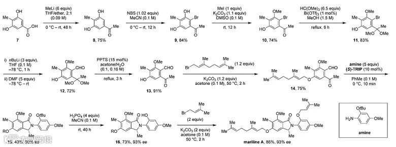 作者利用发展的方法对Mariline A的合成进行了研究。首先他们使用苯甲酸7作为底物与甲基锂反应得到酮8,接着在NBS的作用下发生溴代得到单溴代产物9。9随后进行选择性酚羟基甲基化和酮羰基保护得到中间体11,两步产率分别为74%和83%。11发生甲酰化并消除保护基得到醛13,接着进行另一个酚羟基的O-烯丙基化反应,以75%的产率得到中间体14,14在标准的催化条件下得到手性异吲哚啉酮15。15进一步消除叔丁基保护基和O-烯丙基化得到最终产物。