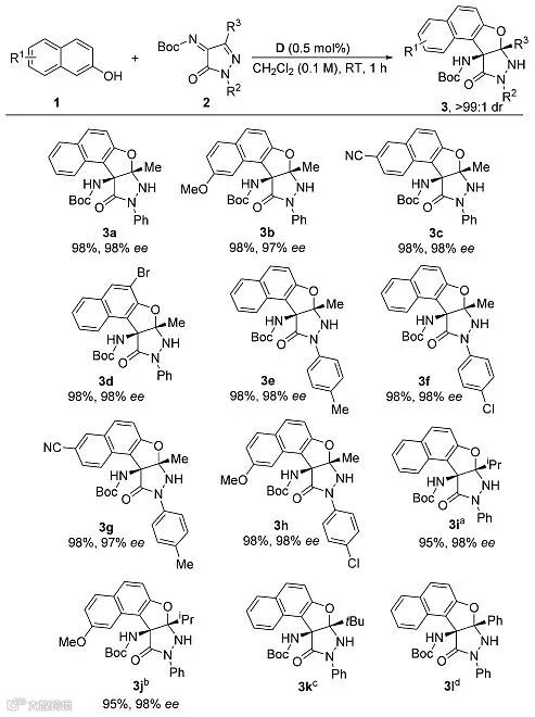 在优化的反应条件下,作者对底物的普适性进行了考察,主要考察不同R1、R2和R3取代基对反应结果的影响,2-萘酚芳香环、N-1位N-苯基上取代基的位置及电性对反应结果无明显影响,都能以优秀的产率(95-98%)和对映选择性(97-98%)得到目标产物。R3换作异丙基时反应仍可以顺利地进行,但当R3为叔丁基时,反应受到空间位阻的影响无法进行,而当R3为苯基时,反应虽然可以得到相应的产物,但是后续的分离提纯非常困难。