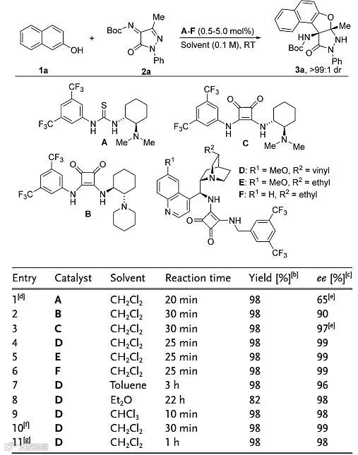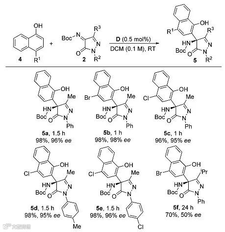 作者首先选择2-萘酚1a与吡唑啉酮衍生的酮亚胺2a作为模板底物对反应条件进行筛选。手性硫脲、方酰胺等许多有机分子催化剂都能实现高产率和高对映选择性的反应,最终综合产率、对映选择性和反应时间,作者得出最佳的反应条件是:1 mol%的方酰胺D作为催化剂、CH2Cl2作为溶剂于室温下进行,30 min后反应能以98%的产率、99%的对映选择性得到目标产物。